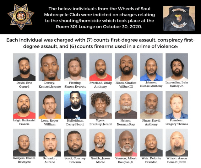 The Charles County Sheriff’s Office announced on Friday, July 22, that 21 members of the club have been identified and apprehended for their roles in a shooting at Room 301 on Crain Highway in Waldorf.